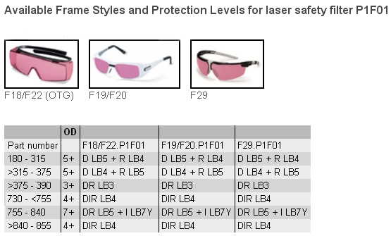 Available Frame Styles and Protection Levels for laser safety filter P1F01